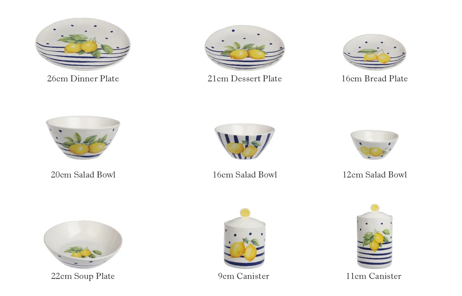 Welcome to purchase wholesale ceramic bowls. This lemon-patterned soup bowl bulk showcases an invigorating lemon motif, combined with blue stripes, providing a cheery and cheerful look with layers of Mediterranean depth.