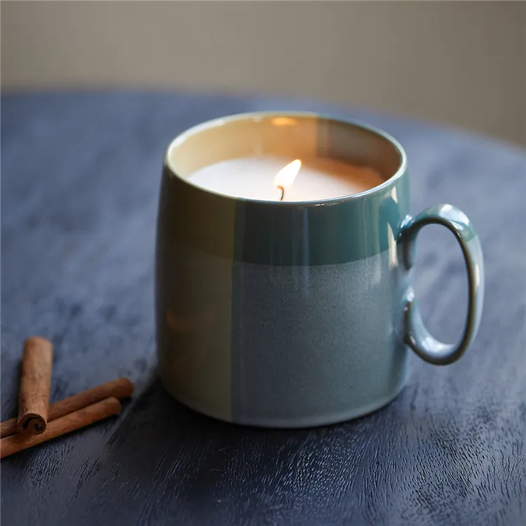 Welcome to purchase candle jars in bulk. Premium two-tone ceramic mug candle vessels bulk. Features unique glazes and a reusable handle. Perfect for high-end custom branding in wholesale orders.