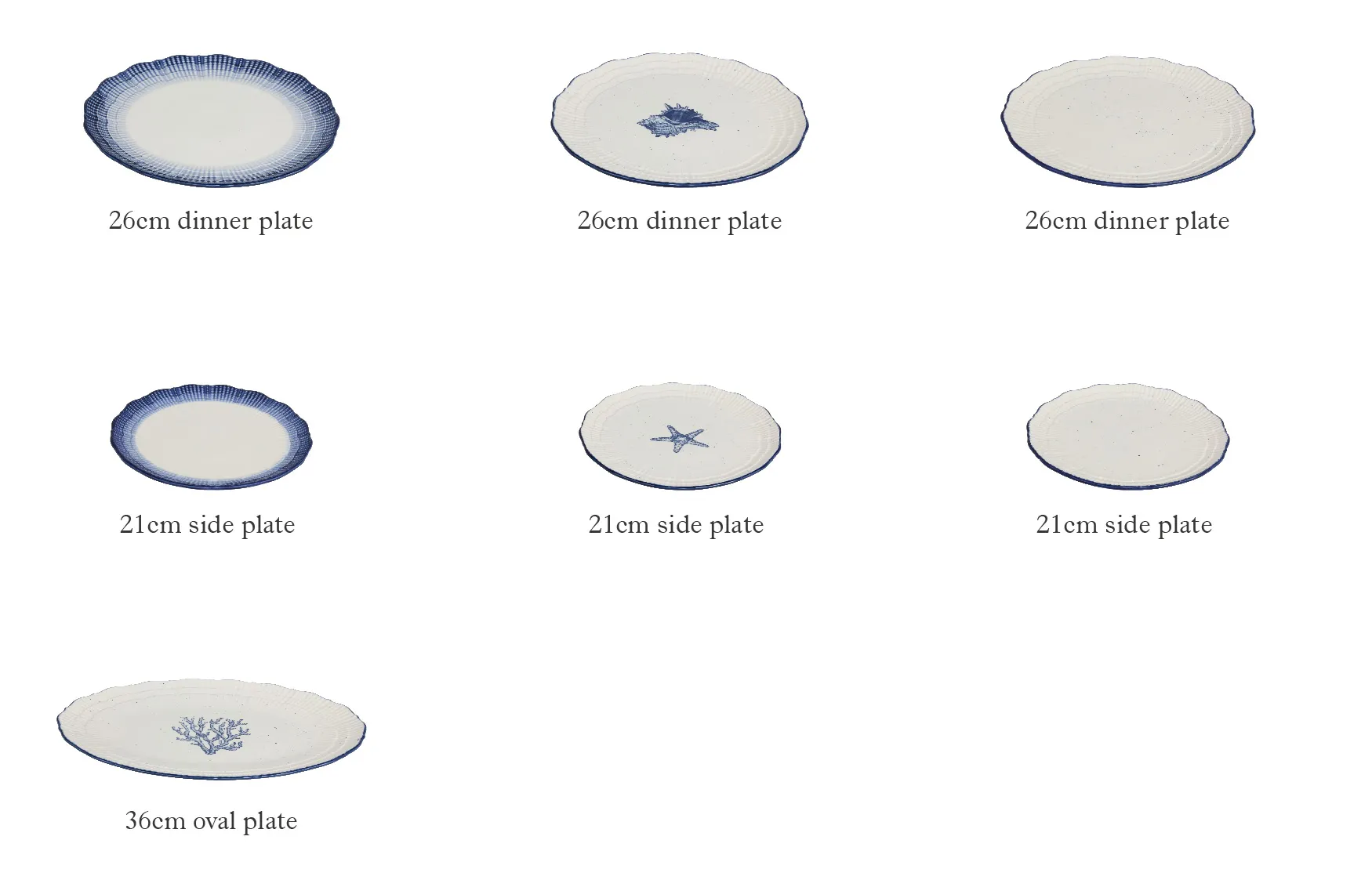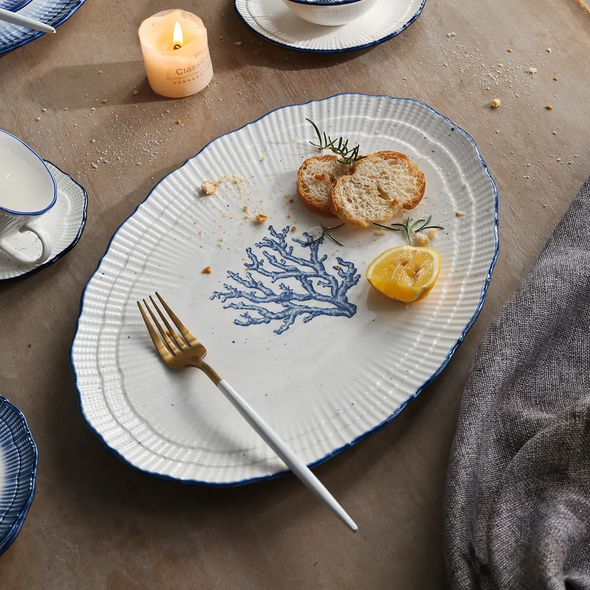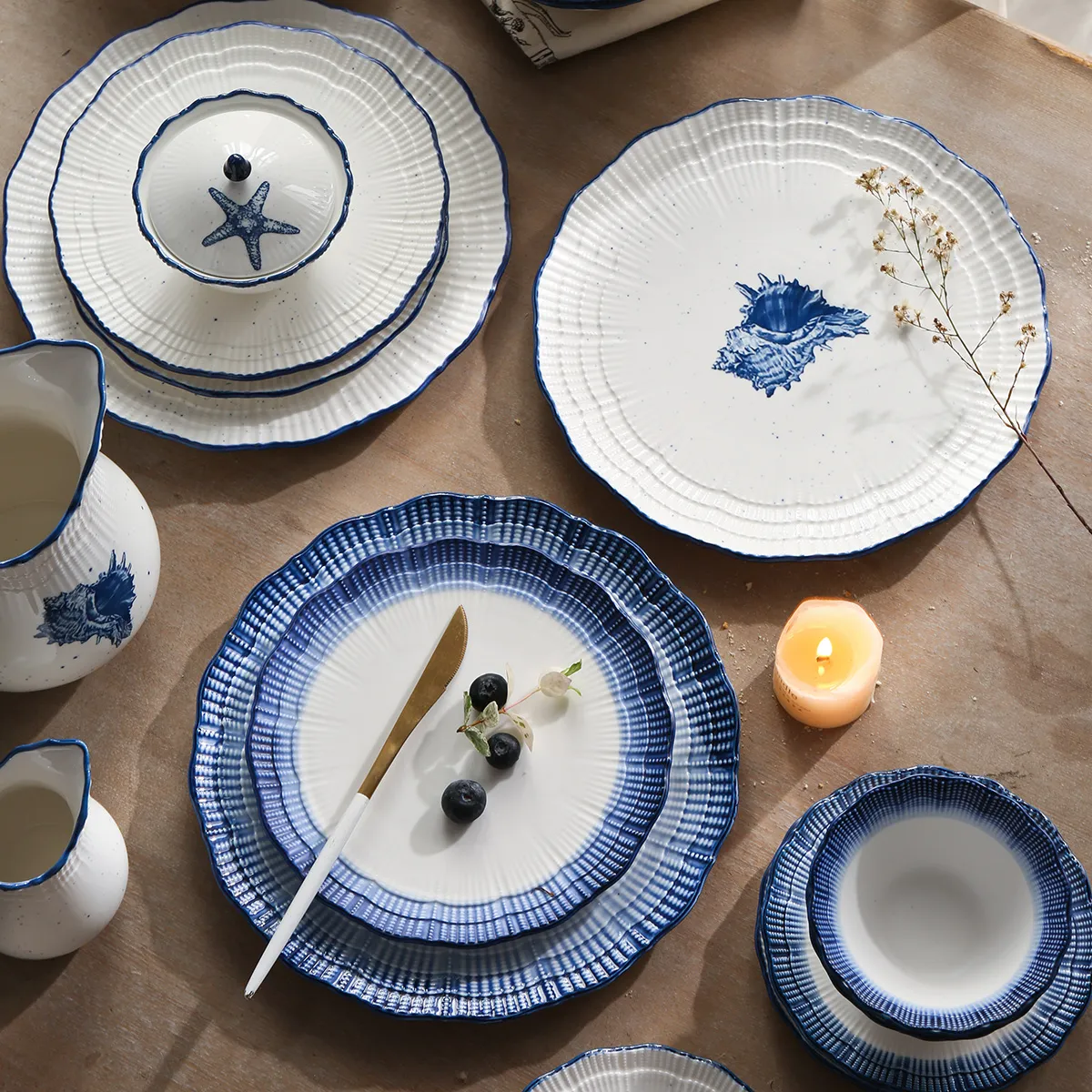 Welcome to purchase restaurant supply dinner plates. Our Ocean Elements bulk ceramic plates feature a simple and elegant design, delicately textured with marine motifs like coral and starfish, bringing an artistic touch to every meal.