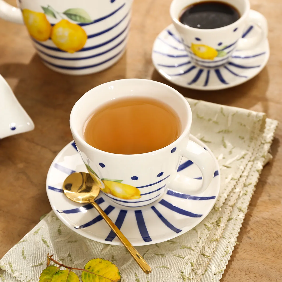 - Fresh lemon design, brightens tea breaks – The refreshing and lively combination of lemon yellow and blue and white stripes on these tea cups and pots wholesale adds a natural and bright touch to afternoon tea, offering both visual and flavorful enjoyment.