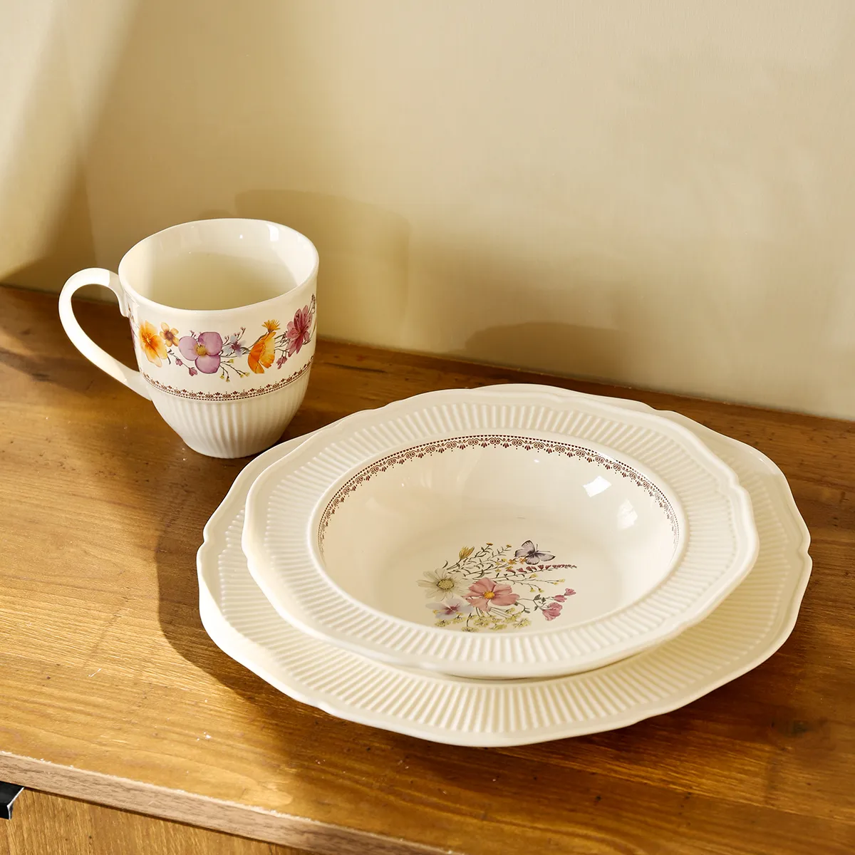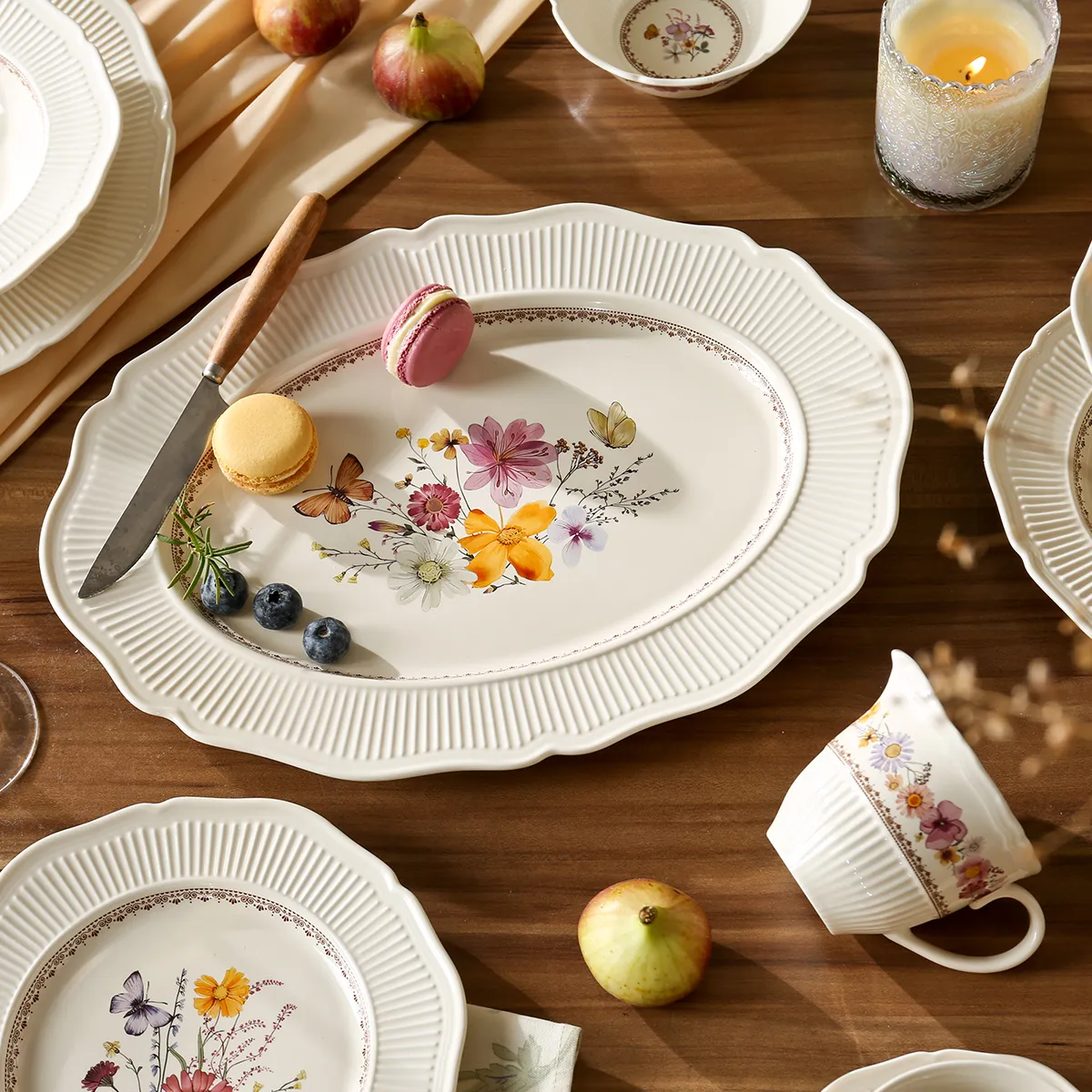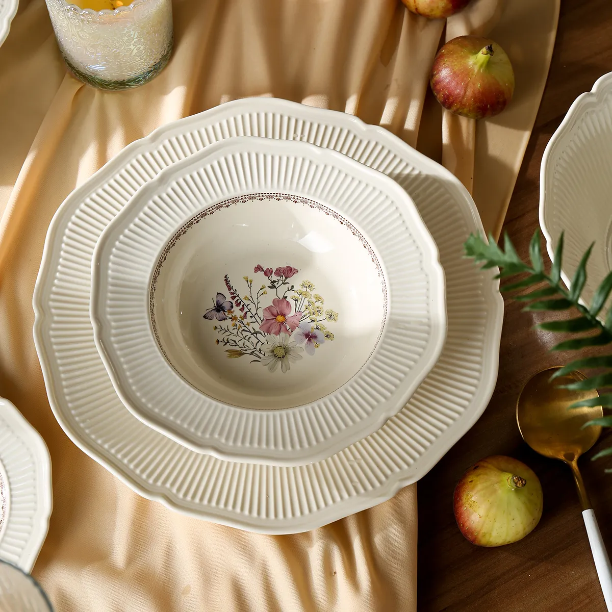 - Floral patterns, lifelike and vibrant: This crockery set wholesale uses fine hand-painting techniques, with bright colors and distinct layers in the floral and butterfly patterns, infusing your dining table with a natural artistic atmosphere.