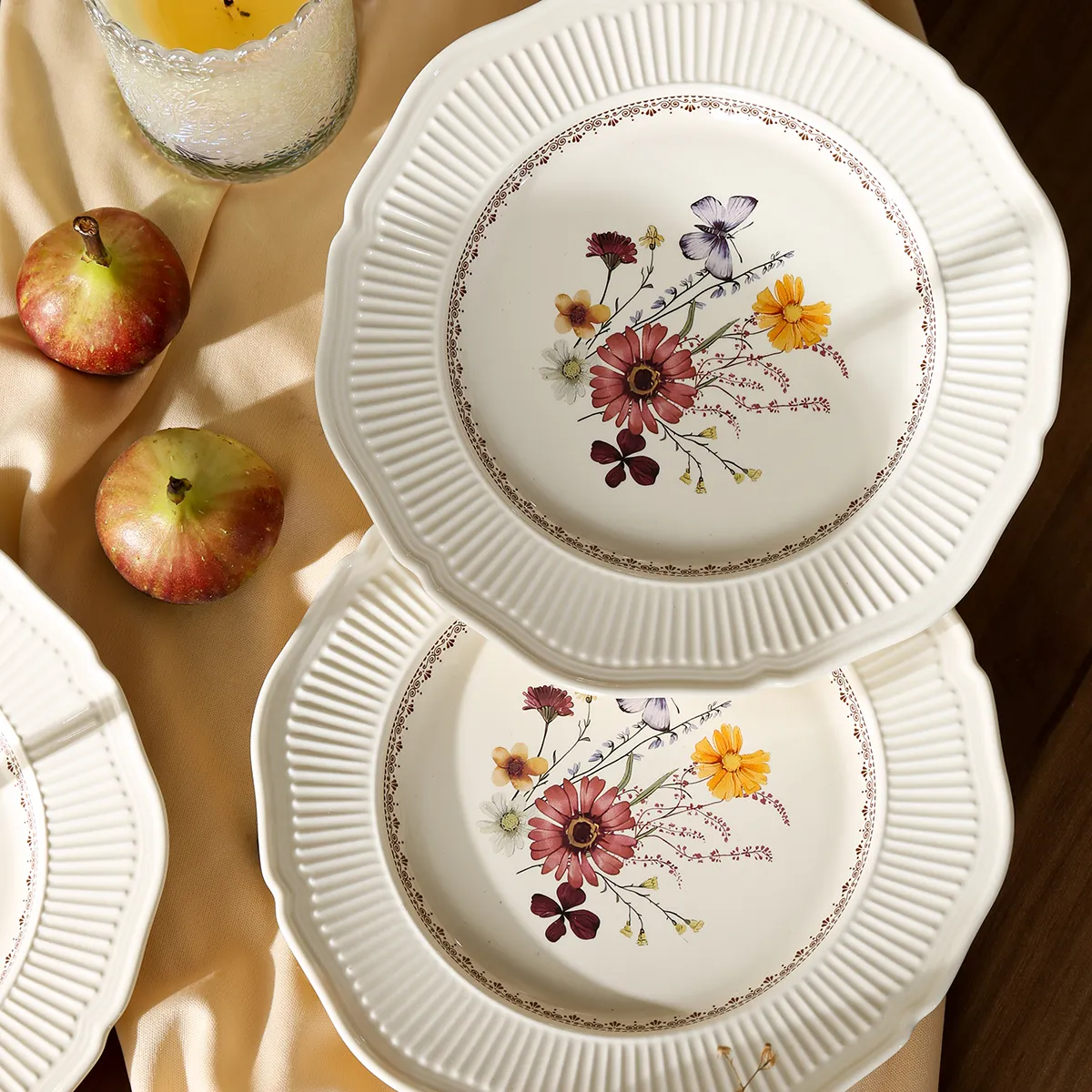 - Warm atmosphere creation, strong display appeal: These floral wholesale tableware items use a highly integrated off-white base color and warm wood tones, easily creating a warm and soothing visual display when paired with greenery and fruits, stimulating purchasing desire.