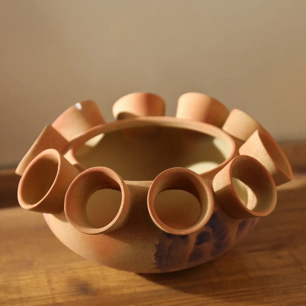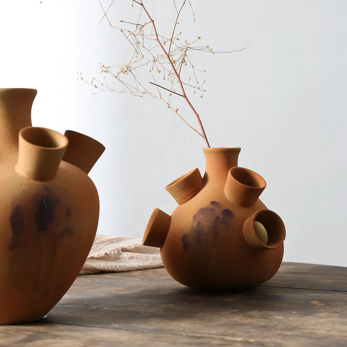 Purchase wholesale floral vases containers now. Our Art Deco vases wholesale are multi-perforated, with varied sculptural shapes, including spheres, hearts, and teardrops. Each of the bottles has a natural rustic brown glaze and handcrafted appearance which heightens its artisan characteristics.