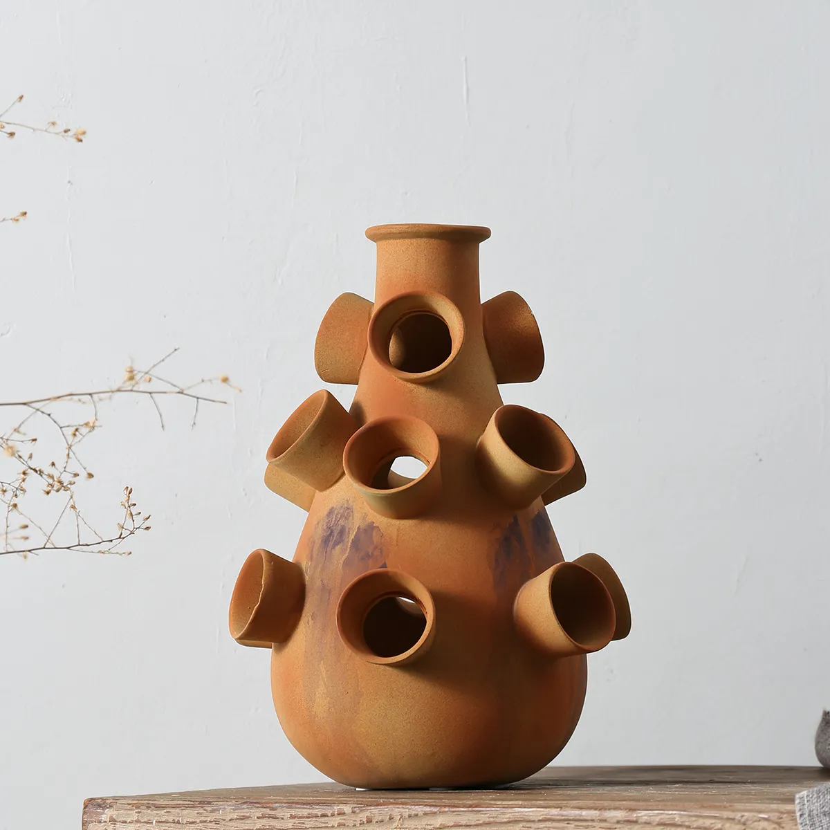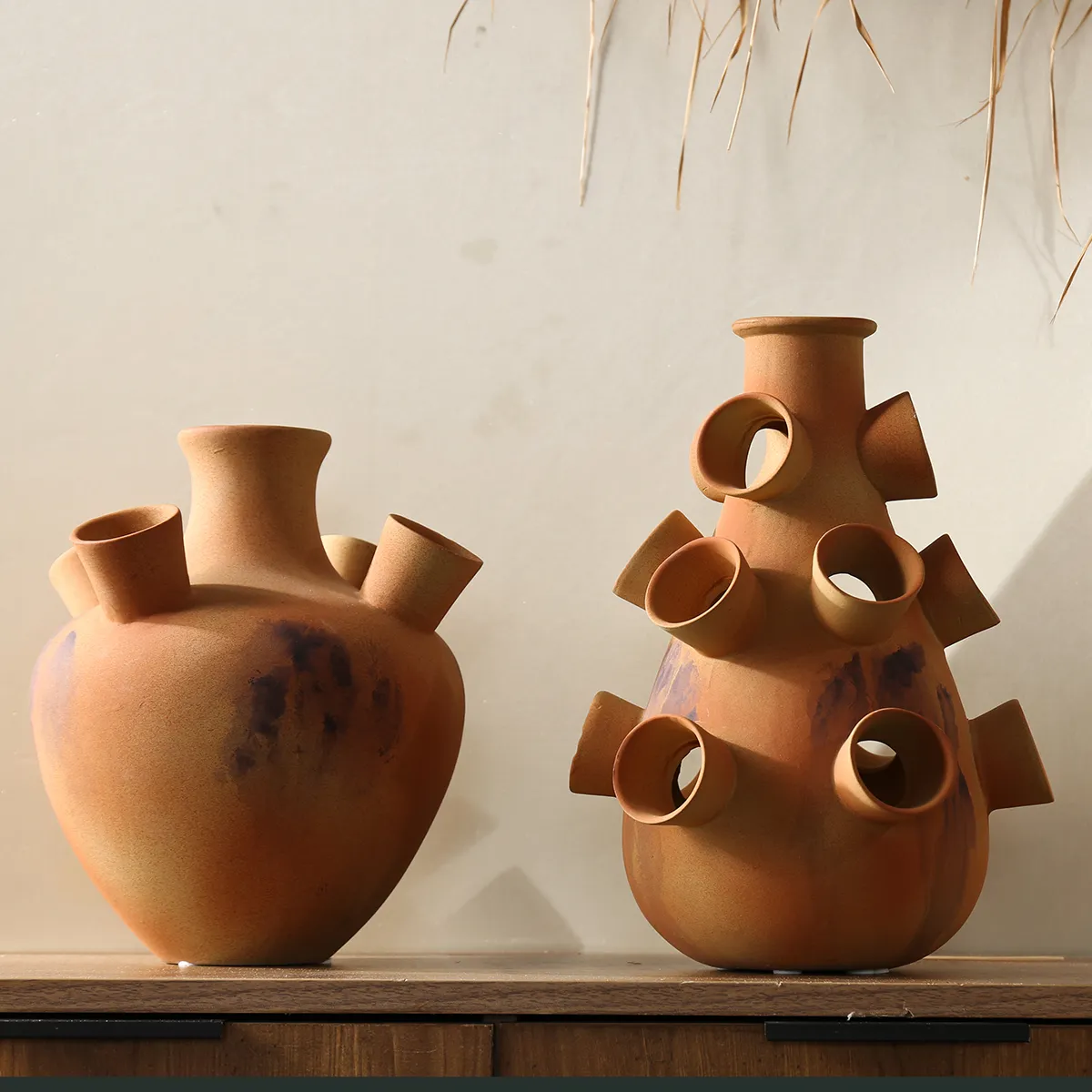 - Natural Handcrafted Texture: The terracotta material of these wholesale floral vases containers retains hand-brushed markings and natural glaze variations. The brown and white color scheme with purple accents provides rustic warmth with a Wabi-sabi design appeal.
