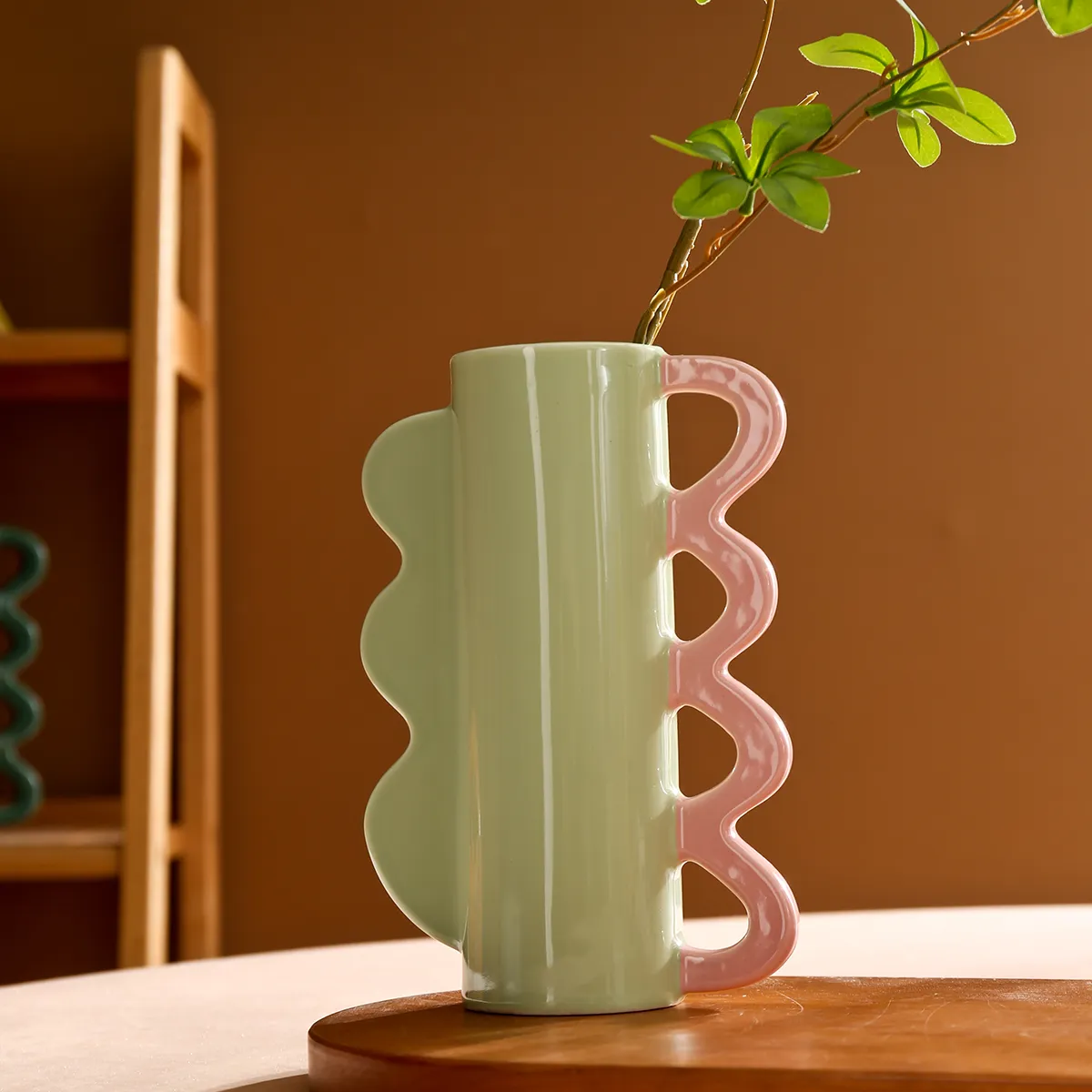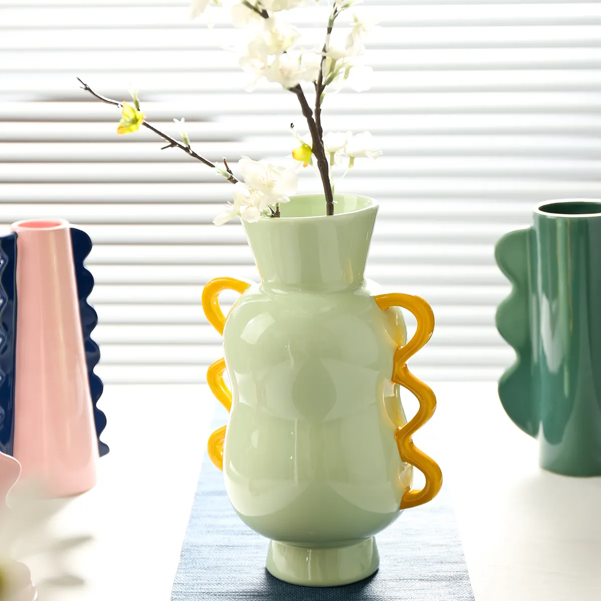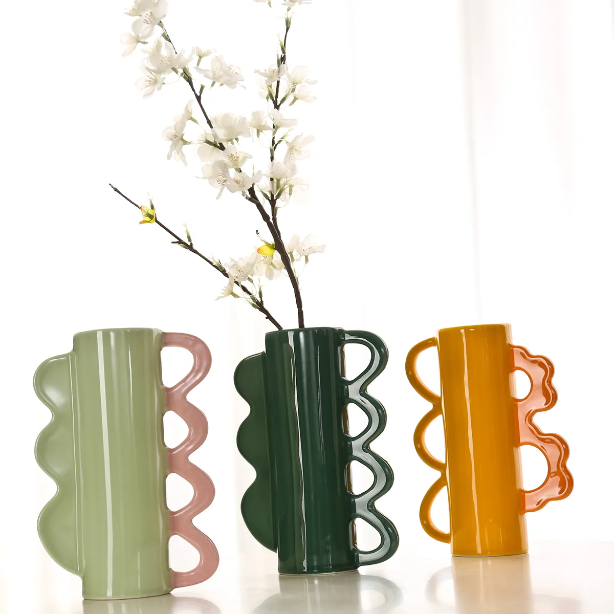 - Design-Driven: This wholesale flower vase series features unique wavy, ring, and spiral openwork handles, combined with bold color schemes and sculptural shapes.