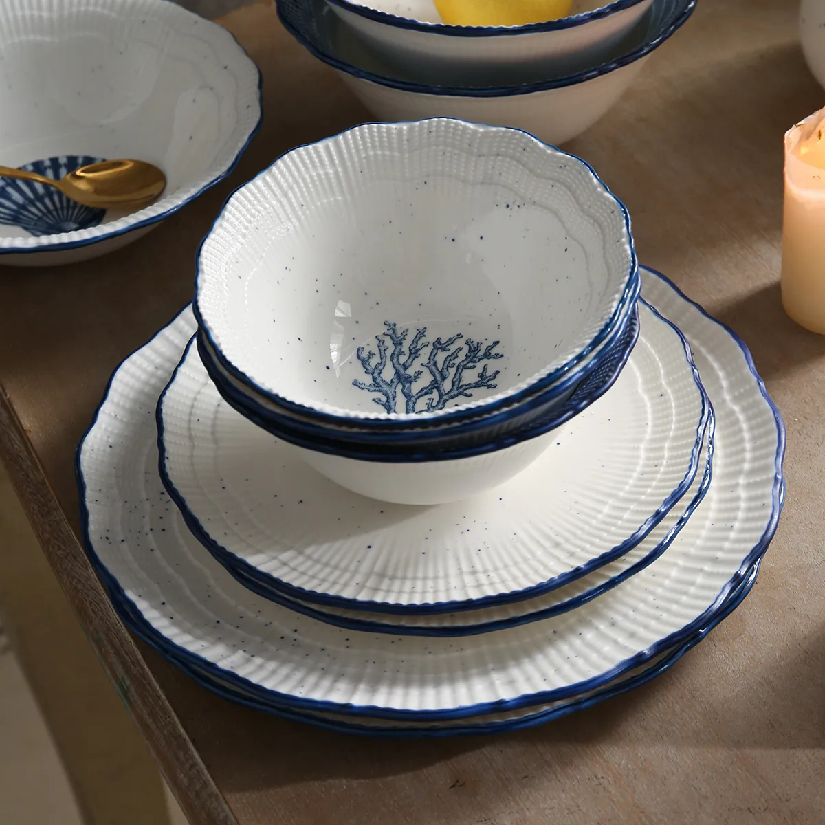 Welcome to order wholesale porcelain bowls. Our crockery bowls wholesale have a marine theme, a white glaze with blue rims and coral texture, all contributing to the idea of a fresh and natural dining experience.