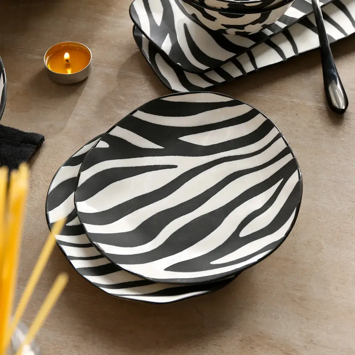 • Flexible setting options to enhance the overall presentation: Our wholesale salad bowls come in various patterns (such as speckles and stripes) and sizes that can be freely combined. They can be paired with matching plates from the same series (such as the 26cm zebra-striped plate shown in the image) to create a unified style, or mixed and matched with metal cutlery, wooden trays, and greenery to enhance the aesthetic depth of the dining table.