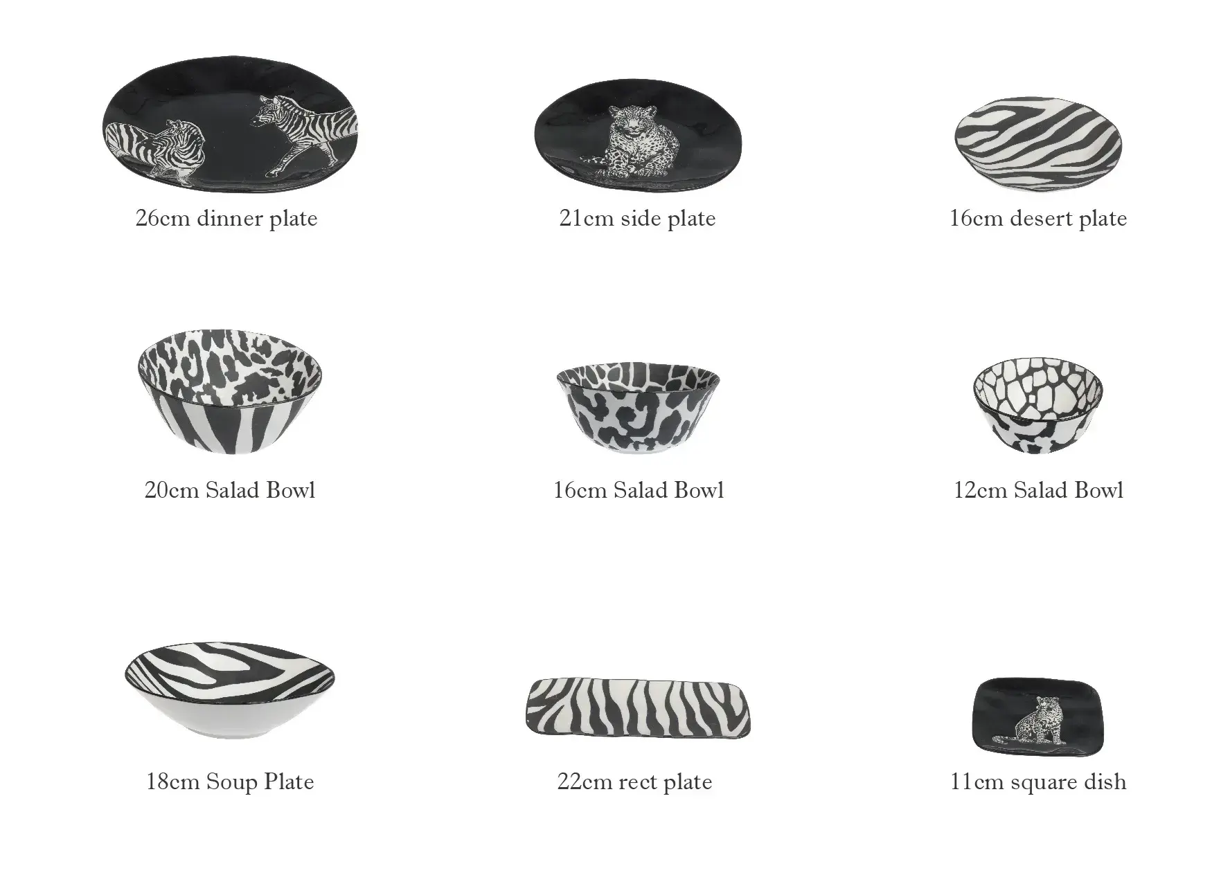 Welcome to purchase dinnerware bowls in bulk. Our modern salad bowls wholesale feature highly recognizable zebra and leopard print elements, offering a wide range of sizes from 12cm to 20cm.