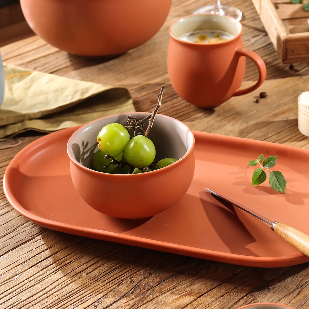 Welcome to purchase crockery plates wholesale. Our set of orange serving plates in bulk features a unique matte orange glaze exterior and a satin glaze interior, perfectly combining beauty and practicality. Available in round and oblong designs, they cater to a variety of sizes.