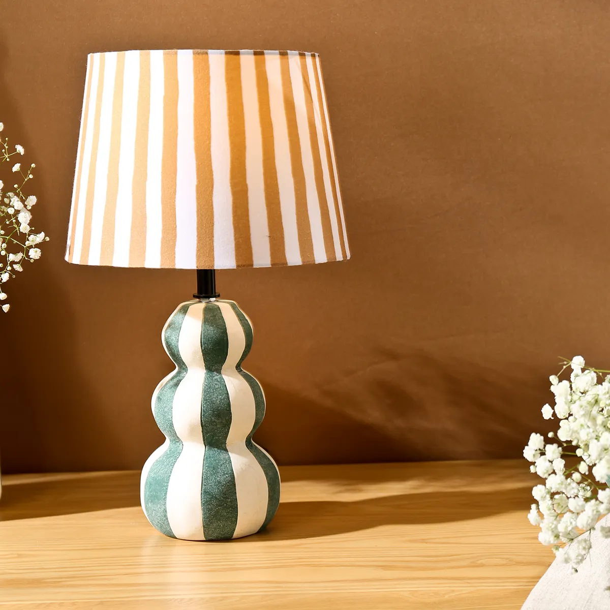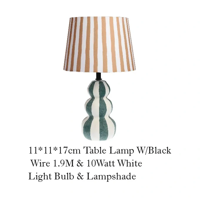 Find premium bulk ceramic lamps. Our gourd-shaped wholesale table lamps feature a gourd-shaped ceramic base with green and white stripes, and a striped lampshade in warm tones; it combines modern principles of minimalism with an inspiration from nature.