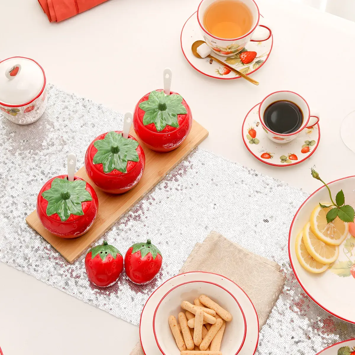 - Exquisite Strawberry Theme Design: This wholesale English tea service set features a lively strawberry pattern, complemented by red trim and green leaf decorations. The lid has a small strawberry handle, creating an overall fresh and sweet style.