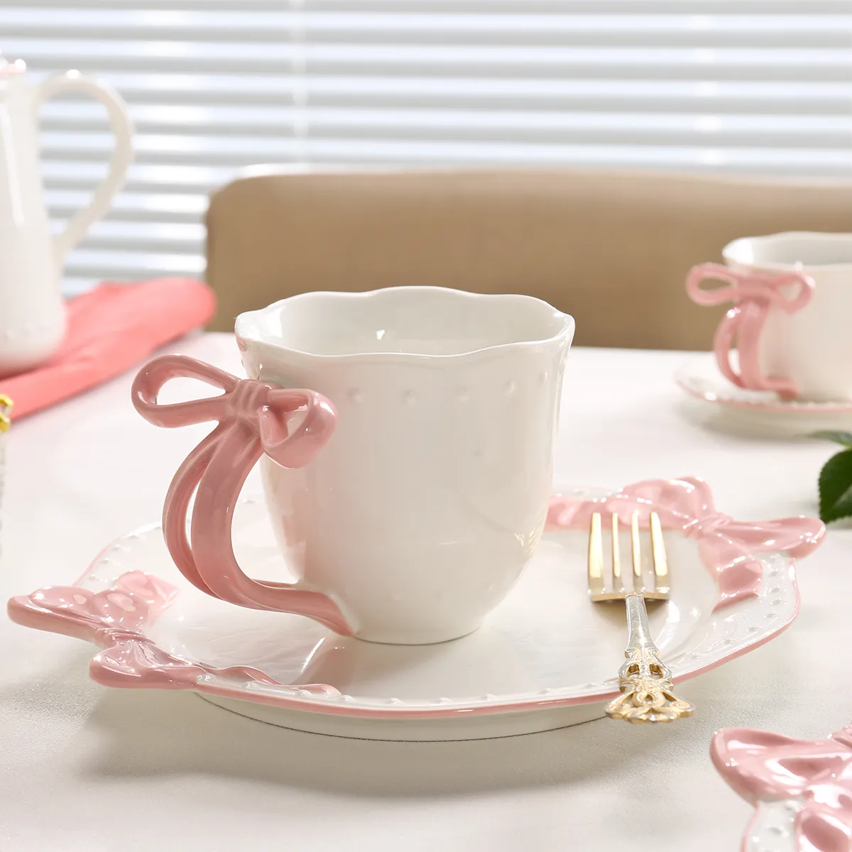 • High-end table aesthetics: Our wholesale ceramic tea sets feature a unique bow element paired with a classic white background, creating a fresh and elegant style. They are not only suitable for everyday home use, but also perfect for afternoon tea presentation in cafes and dessert shops, enhancing the overall style.