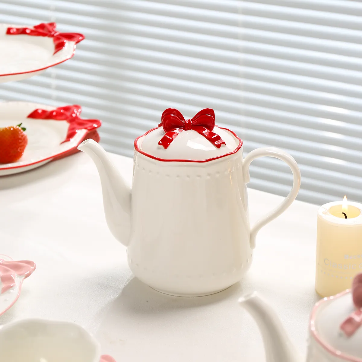 Welcome to purchase wholesale teapots and cups. Our high-quality ceramic tea sets feature a classic white base with delicate 3D bow patterns on the lid and handle, available in romantic red and pink.